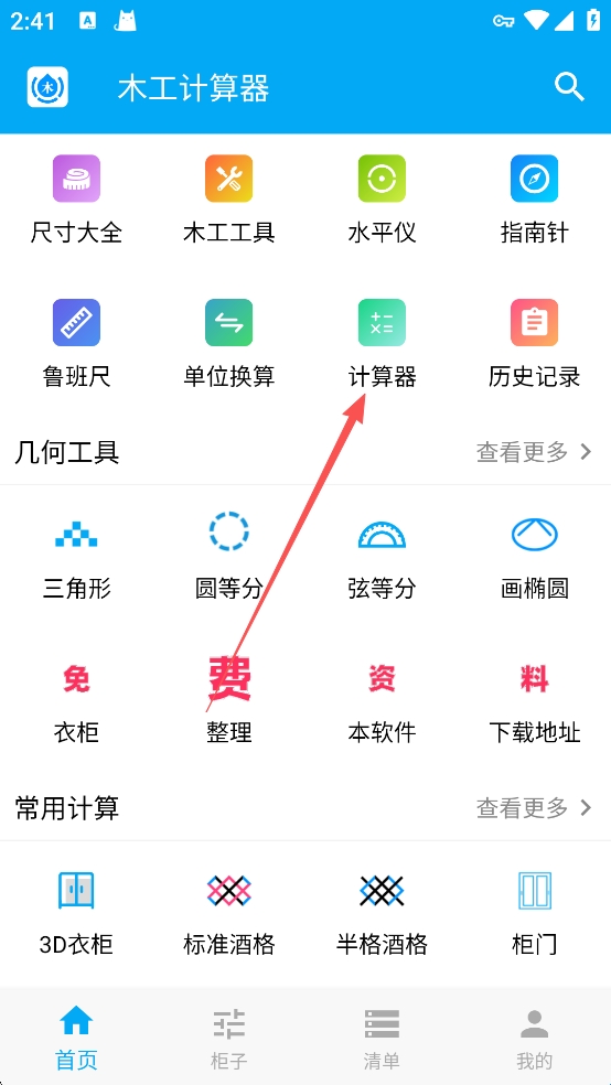 1、打开木工计算器App后在首页点击计算器。