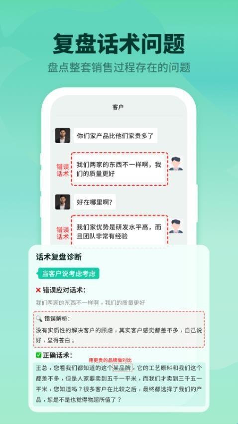 2、通过扫描聊天截图,软件会自动解析对话内容,帮助你发现并改进错误的话术能特别适合销售小白,可以帮助你总结经验教训,提升销售技巧