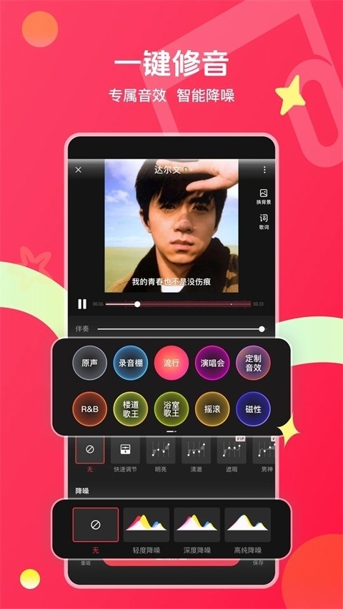 2、质的音效,强大的“一键修音”功能,让你的歌声更动听。