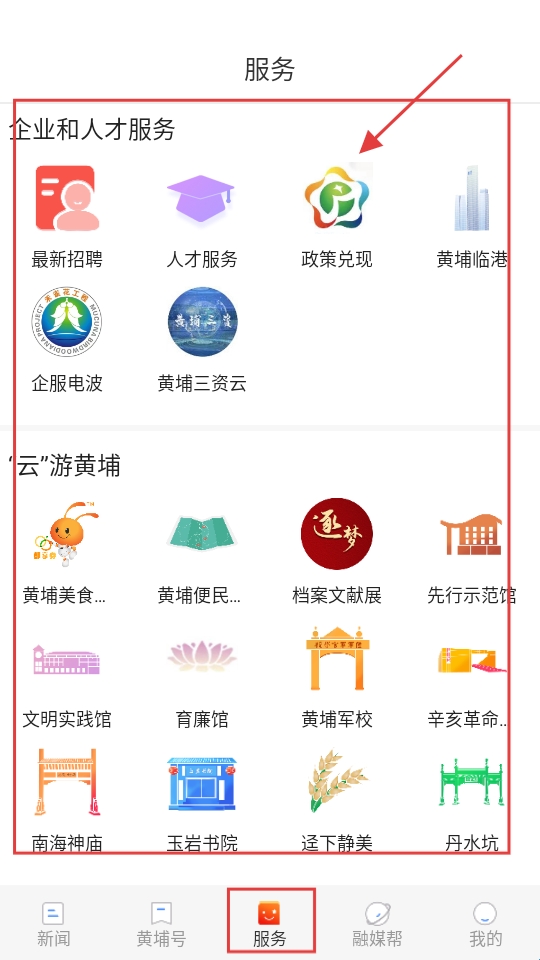 4、进入服务板块后,可查看企业和人才服务、云游黄埔等各类服务,选择需要的服务使用哦。