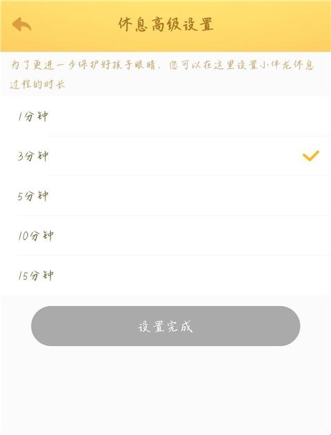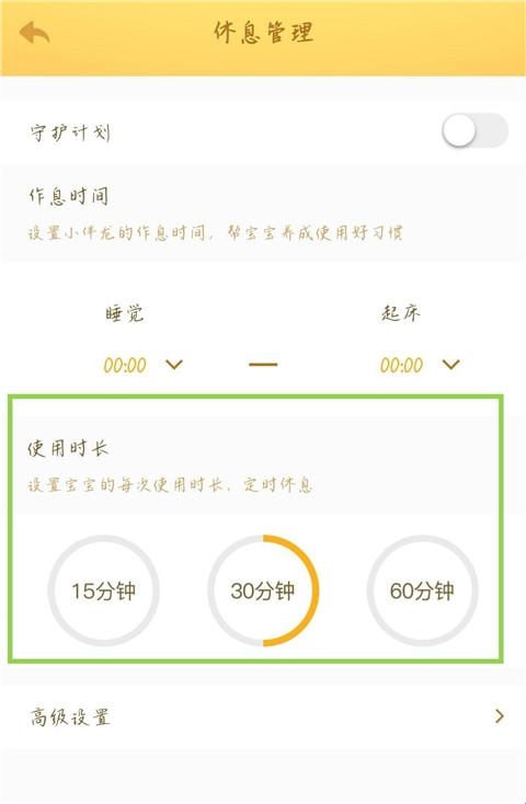 5、进入高级设置,可以设置小伴龙休息过程的时长,在此期间,小伴龙将保持锁屏状态。