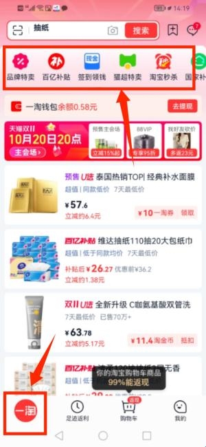 5、一淘购物可享大额现金红包,与优惠券叠加使用,省上加省,一省到底。