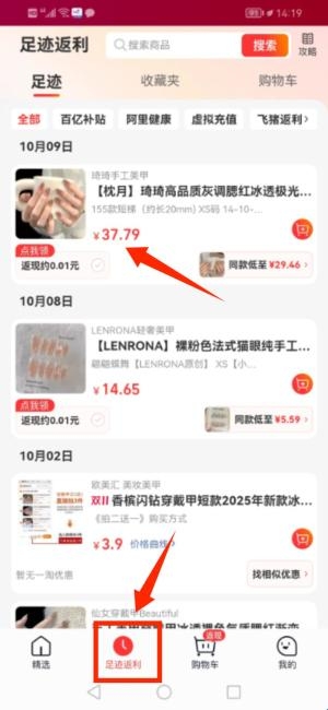 3、点击底部足迹返利可查看浏览记录与相关返利信息。
