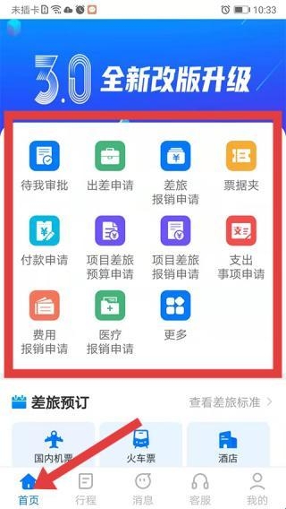 1、公务之家app官方版首页,宣传3.0改版升级,有出差申请、报销申请等功能模块,还有差旅预订入口。