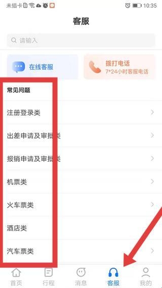 2、公务之家app官方版客服页面,提供在线客服、电话客服,罗列注册登录、出差申请等常见问题分类。