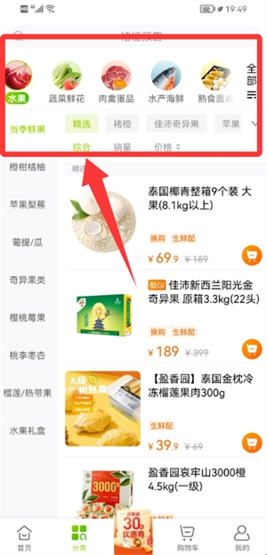 2、在分类页面选取水果等商品类别,通过标签筛选浏览商品。