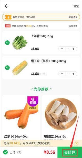 3、以上面同样的方法再添加其他的商品,全部添加完成后,点击下方中间的购物车图标即可开始结算。