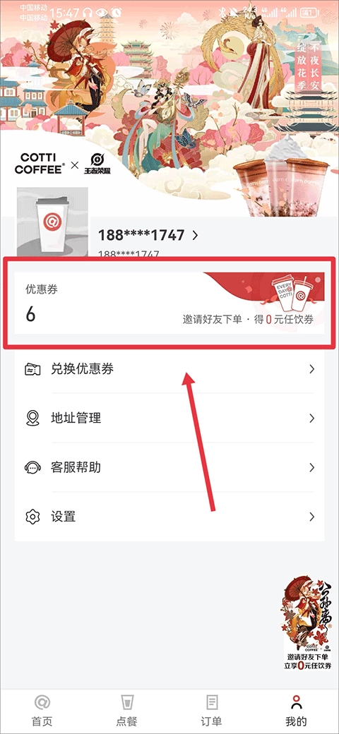 4、软件中会提供各种优惠券,在支付时可以选择使用,同时邀请好友下单还可以获得0元任饮券