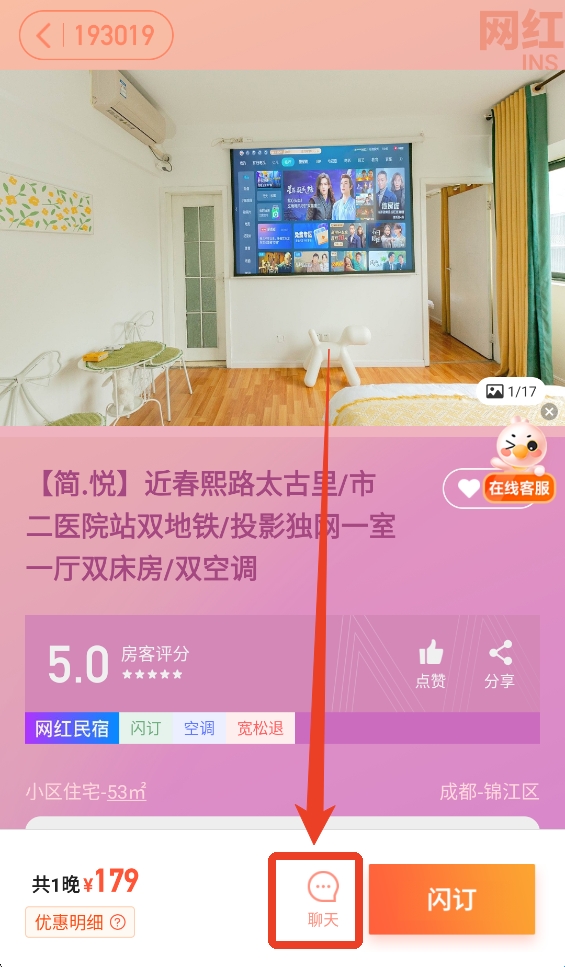 2、选择你的入住时间和房客人数点击下方的立即咨询,之后就能与房东交流了。