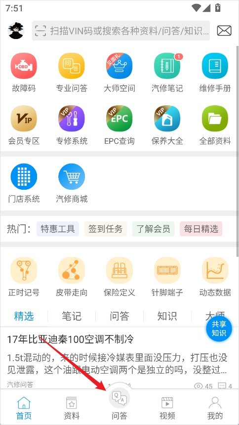 1、打开汽修宝典App后,在底部导航栏中点击【问答】,进入汽修技师专属的互动社区页面。
