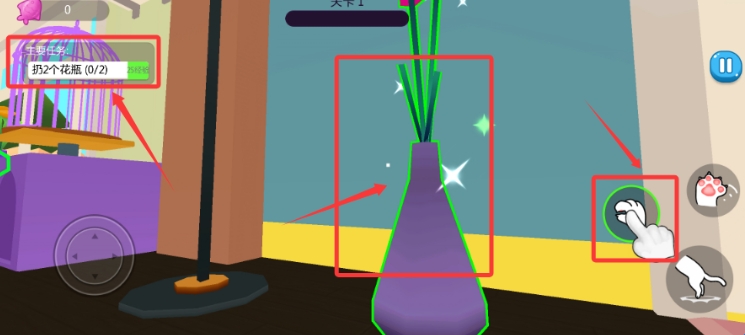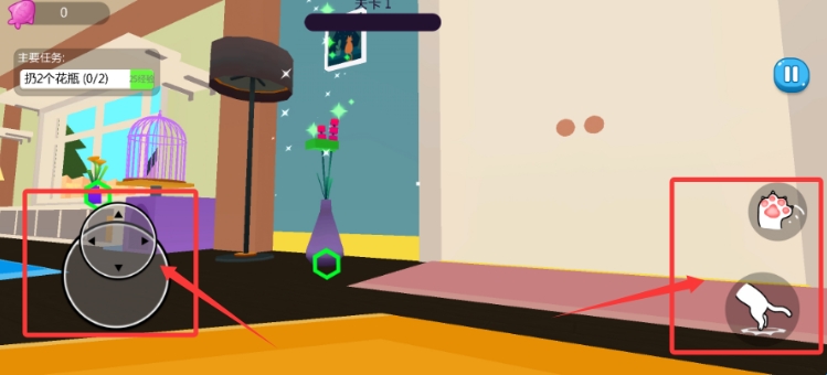 1、通过虚拟摇杆控制猫咪移动,点击右侧功能键实现跳跃攀爬、抓取物品等动作。