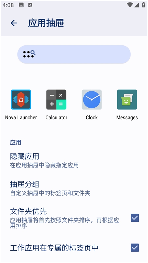 应用程序抽屉文件夹、无限自定义标签、整理应用程序到抽屉中的标签和文件夹。