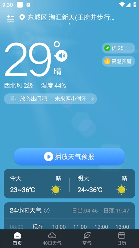 2、下拉显示24小时详细天气与15日天气预测,下方还有生活温馨小提示;