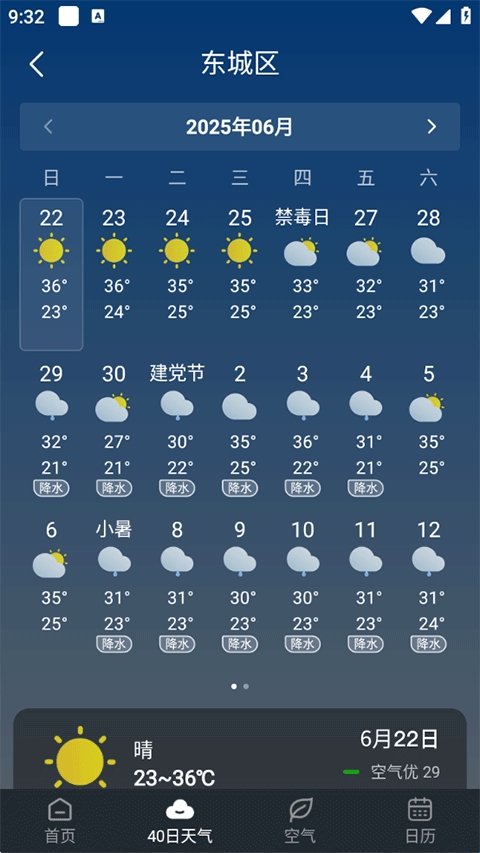 3、点击40日天气可显示您所在位置40日内的天气预报,为您出行做好万全准备;