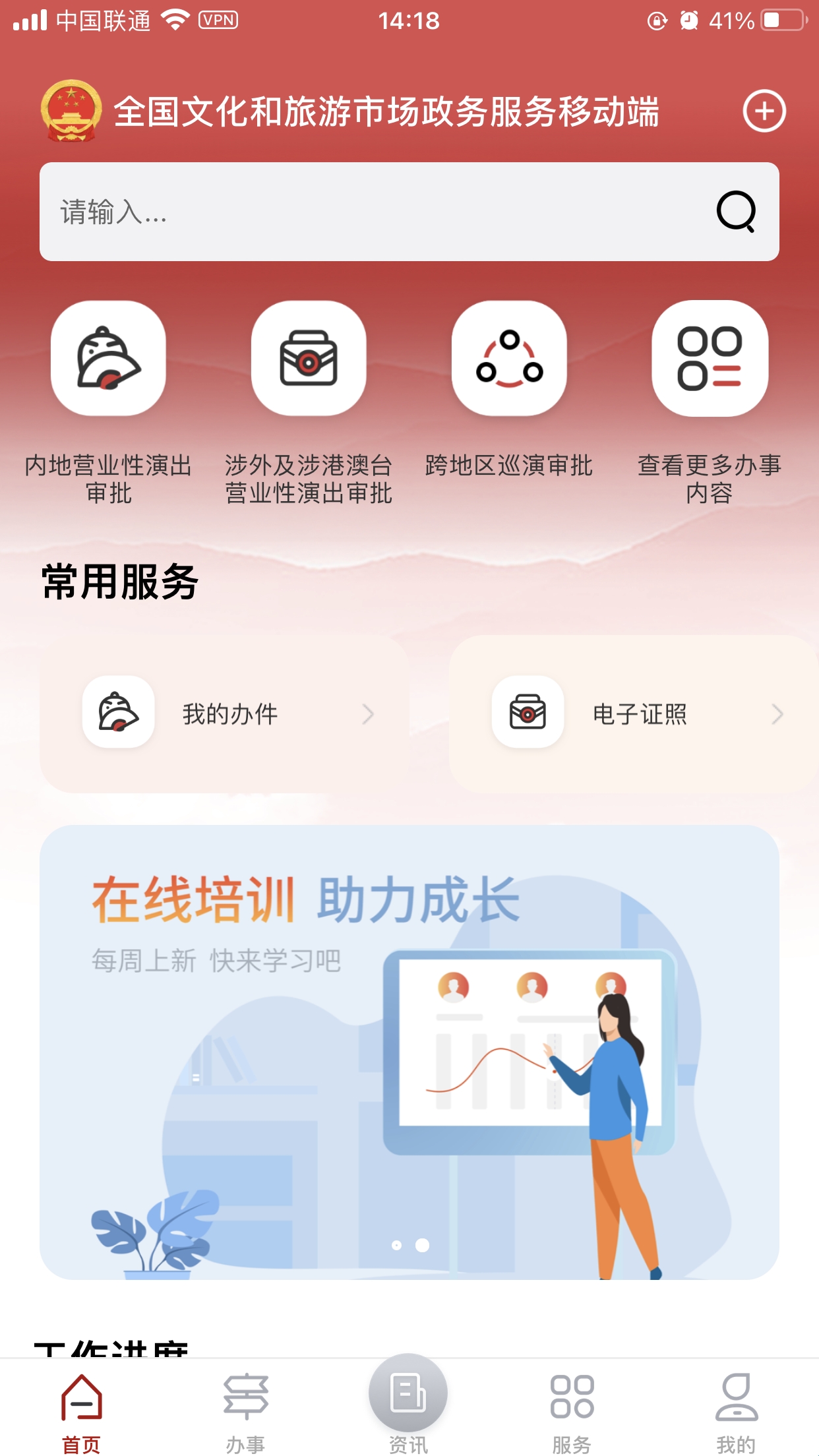文旅市场通是由文化和旅游部市场管理司设计运行的全国文化和旅游市场政务服务软件,线上界面功能板块丰富多样,政策资讯发布、行政审批办理、在线培训学习、电子证照应用等服务事项在这里都可以看到,不仅可以随时获取最新的政策信息,了解行业动态和发展趋势,而且还可以在线查看你喜欢的明星演唱会,或是进行演出申报和审批,操作都很方便,极大地提高办事效率。