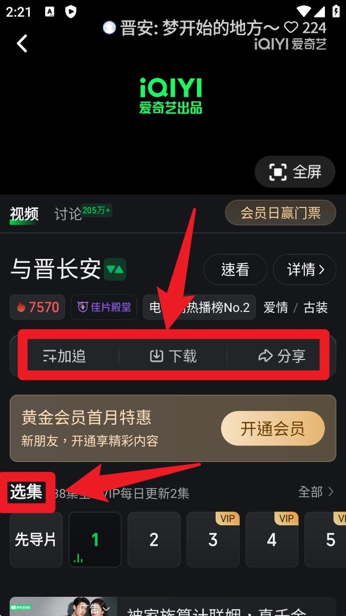 5. 进入剧集播放页后,点击下载、加追、分享按钮,并可在「选集」处切换集数播放。