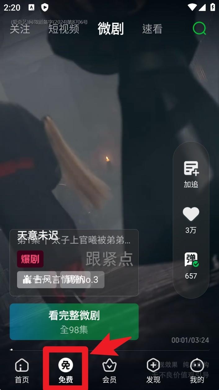 2. 切换至「免费」频道,可直接观看平台提供的免会员热门剧集和短视频内容。
