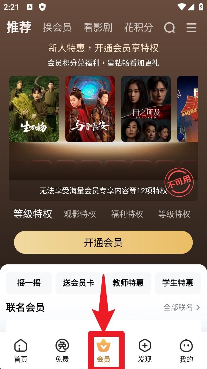 3. 点击「会员」按钮可查看会员专属剧集,支持开通会员、参与福利活动及积分兑换等。