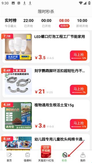 4、限时秒杀页面有实时榜等场次,展示LED灯泡、鹦鹉脚环、生根活土宝等商品,折扣力度大,可及时马上抢。