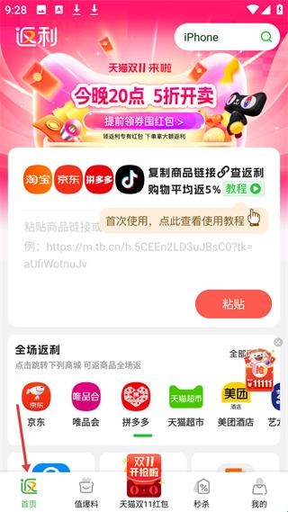 2、首页有天猫双11活动,可复制多平台商品链接查返利,还有京东、唯品会等全场返利入口,首用可看教程。