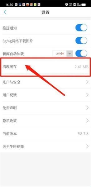 2、然后来到设置的页面中有清理缓存、账户与安全、用户反馈等功能,我们直接点击【清理缓存】;