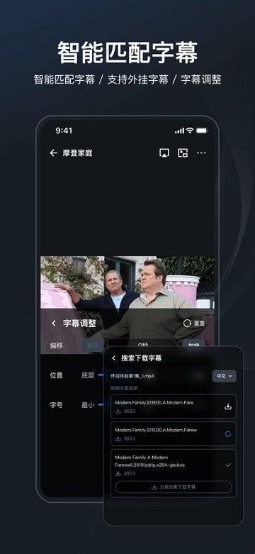 支持智能搜寻影片字幕并自动下载,支持切换多语言字幕,支持下载和添加外挂字幕、调整字幕的字号、位置和时间偏移。
