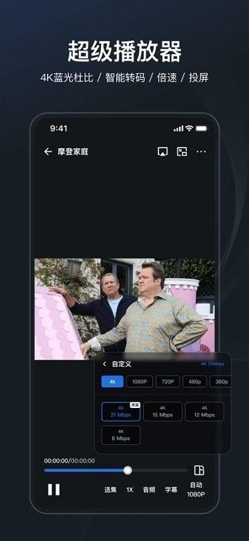 实时转码,支持流畅播放 4K、杜比、蓝光原盘。强大的播放器支持TV投屏、倍速播放、视频码率调整、音频调整、画面比例调整等功能。