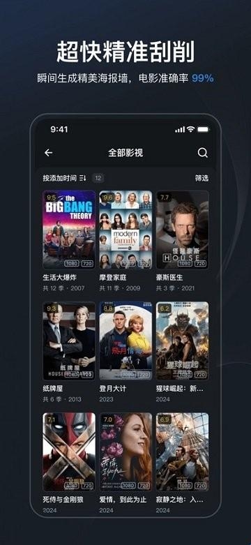 自带智能刮削,瞬间刮削生成精美的海报墙和完整的影片信息,电影刮削准确率为99%。