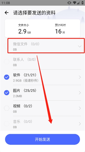 4、点击迁移到另一台设备:打进入换机助手app,打开“旧机发送”在微信文件一栏中选择到备份的聊天记录文件。