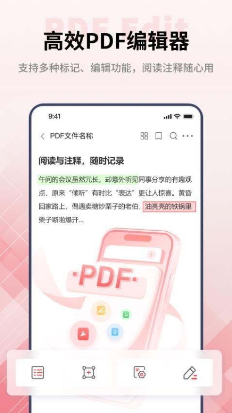 PDF阅读编辑大师app,一款实用性非常强的文档编辑工具。软件支持文档注释、阅读编辑、自定义设置、PDF合并、拆分等功能,帮助用户随时管理文档,方便用户的操作,无需付费,直接一键导入;适用于学习、办公情况下。需要的用户快来下载吧!