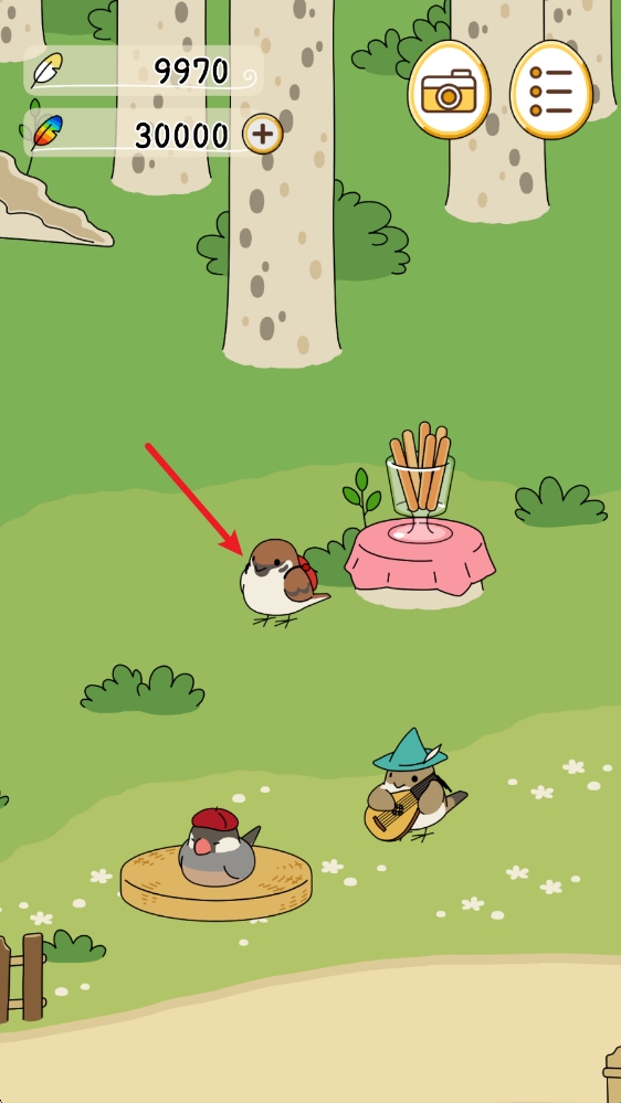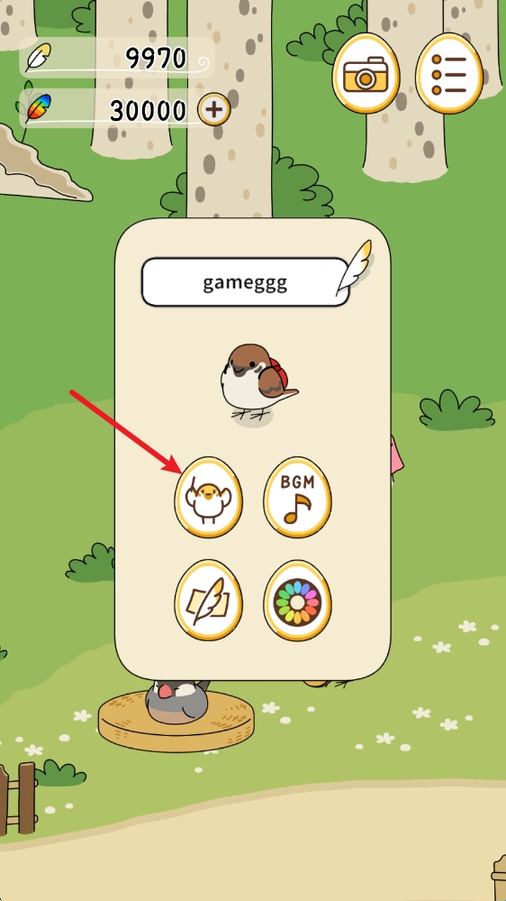 2、点击小麻雀,会出现几个功能按钮,点击第一个即可让小麻雀开始指挥,和其他鸟儿一起演奏。