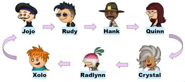 按照“最后一位顾客(closer)”顺序表(如下图)确定二人到来的日子,到达该天后先暂停进入顾客信息界面,查看该顾客的点单内容,然后一开始就把面包炸好,等到接下第六位顾客的订单后马上制作,制作完再接单然后马上提交,此流程可以达成成就。