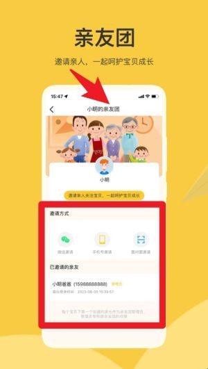 4、进入小明的亲友团页面,用户可通过微信、手机号或面对面方式邀请亲友,共同关注并守护宝贝成长。