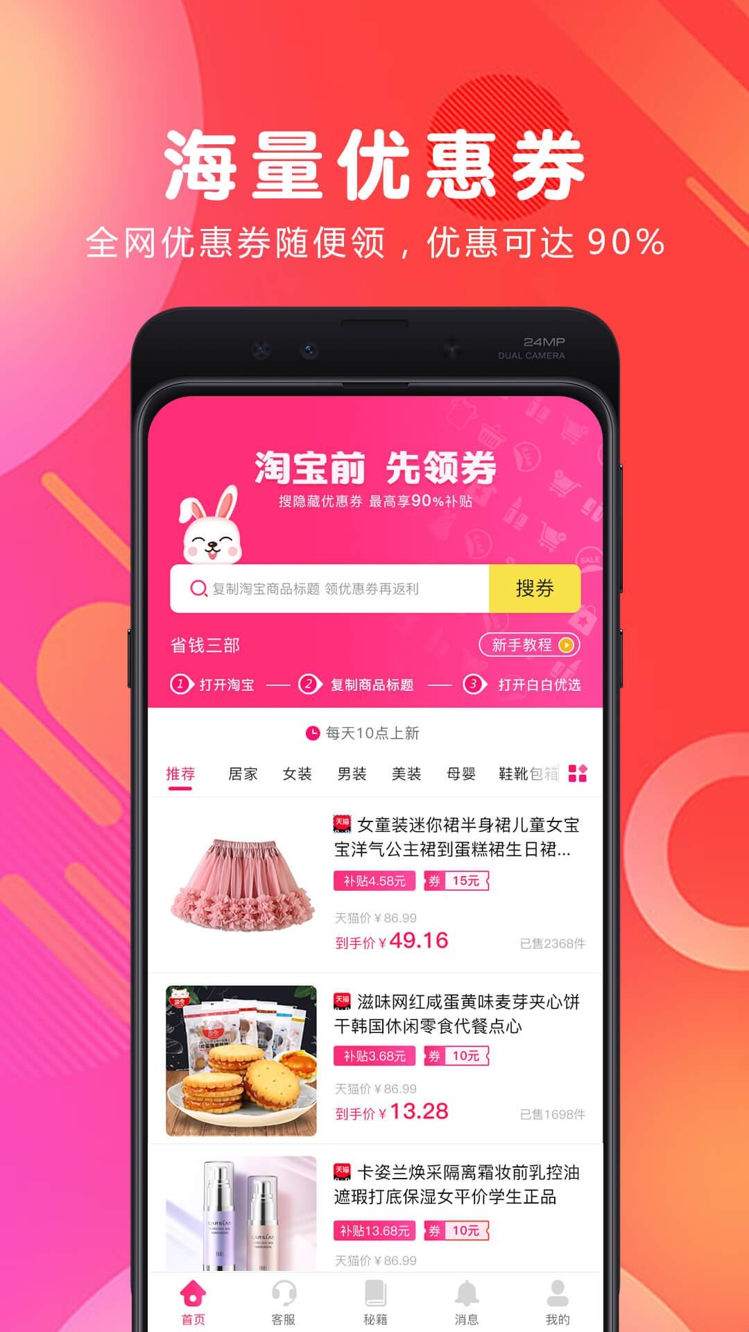 2、一键搜券:在手机淘宝上复制宝贝标题,然后打开白白优选app,会自动帮你找该商品的券。