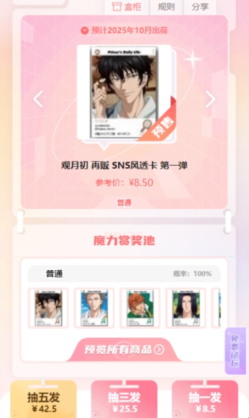 1、抽卡机/魔力赏:支持单抽、连抽,获取限量手办、原画吧唧等周边。