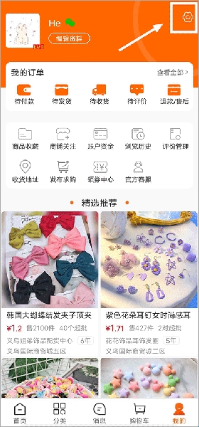 1、打开义乌购首页,首先我们需要使用微信或手机号登录到app当中,进到app后,在我的“界面”点击右上角的“设置”图标。