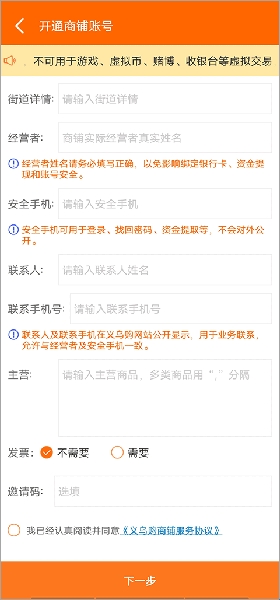 3、接着输入商铺名称、所在地区、街道详情、经营者、安全手机、联系人、主营业务等信息后,点击“下一步”提交申请资料。
