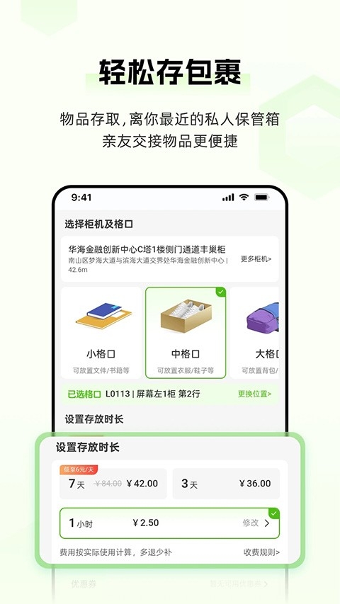 物品暂存,随存随取。1小时起存,支持小时/天/月灵活存储,可提供转寄服务。