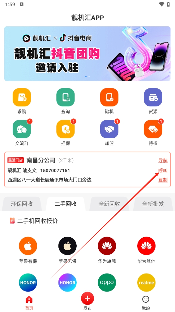 1、首先打开靓机汇APP,点击首页的二手批发;