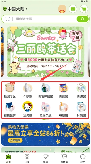 2、首页提供捡漏专区与个护馆等商品分类入口供选择。
