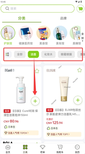 3、进入护肤馆选取洁面分类,点击商品加号即可添加。