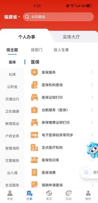 3、来到软件办事页面可查看医保、社保、公积金、交通出行等事项的办事流程。