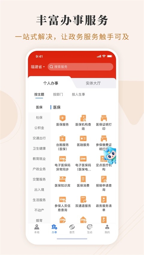 闽政通app是福建省官方的全省通办政务服务平台,软件内涵盖医疗、教育、社保、婚育、交通、住房等大大小小与我们生活息息相关的服务功能,为个人和企业提供了便捷高效的办事通道,从解决百姓需求为出发点,通过多部分协同对接,让上百个政务民生相关事项实现掌上办理。