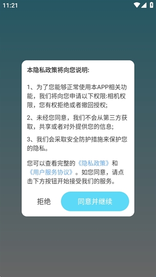 1、打开app,阅读用户隐私协议之后点击同意并继续即可进入;