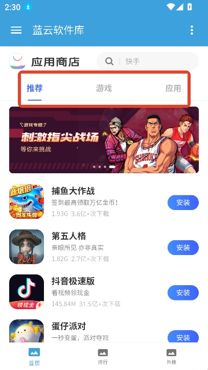 1、软件进入首页,可以选择推荐,游戏,应用等几个板块