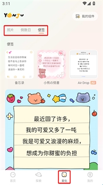 1、在“美化”界面有照片、倒数日和标签三种类型的小组件,点击需要添加的小组件进行预览;