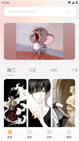 2、首页推送的壁纸类型很丰富,支持快捷搜索,支持热门、动漫以及动物和个性壁纸。