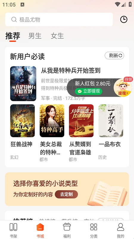 1、在本站内下载安装并打开软件,在书城或分类页面,查看各种题材小说,按分类筛选感兴趣的小说类型。