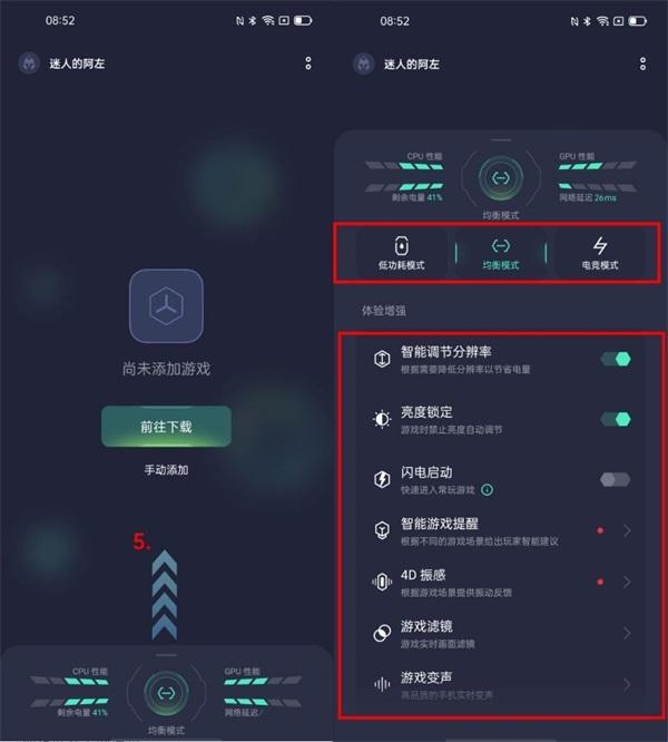 3、在“游戏空间”中上拉可以进入控制台,在这里有3种模式可以选择,分别是“低功耗”、“均衡”和“电竞模式”,如果对打游戏画质延迟等要求比较高的话,推荐选择“电竞模式”。下方还支持“4D振感”、“闪电启动”、“智能游戏提醒”等辅助功能。